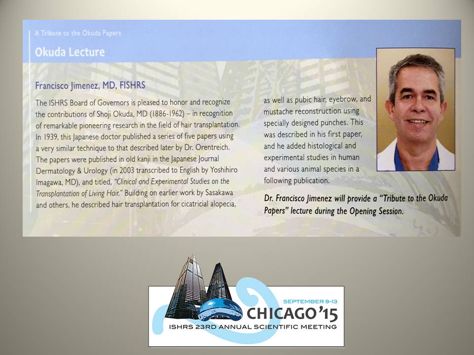 This year the ISHRS invited Dr Okuda’s grandson to come to Chicago to receive a tribute for his Grandfather’s original work in hair transplant surgery.